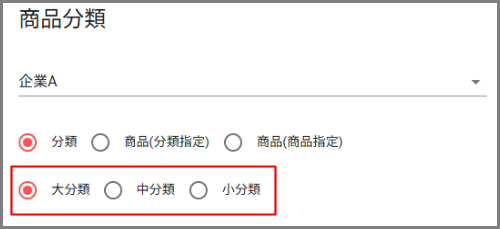 分類、商品いずれかで指定する事が可能です。 初回のデフォルトは、分類となっています。